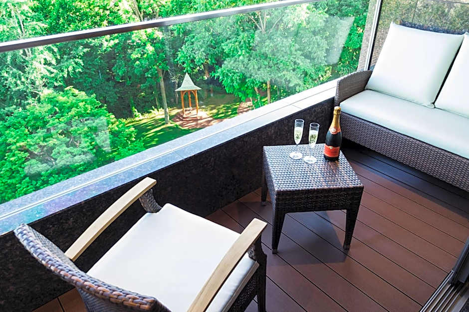 This air-conditioned twin room has a terrace, desk, wardrobe, sofa and heating. Amenities include an electric kettle, refrigerator, free toiletries and LCD TV. The room size is 31 square yards and features floor-to-ceiling windows with a garden view.